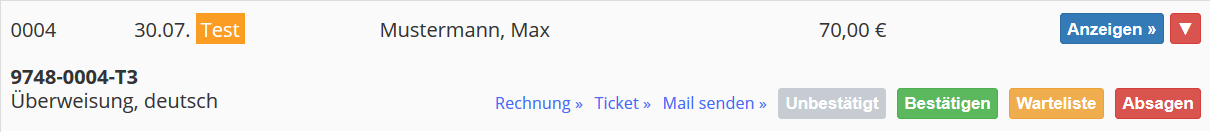 Auf der rechten Seite jeder Teilnehmerzeile finden Sie zwei Schaltflächen. Mit „Anzeigen »“ können Sie sich die Details der Buchung ansehen und Änderungen vornehmen. Sie sehen dort das ausgefüllte Anmeldeformular und haben die Möglichkeit, dieses zu editieren. Damit können Sie z.B. fehlerhafte Mailadressen korrigieren oder den Teilnehmer auf einen anderen Workshop umbuchen. Vergessen Sie nicht, danach auf „Speichern“ zu klicken. Wenn Sie zusätzlich eine Mail mit den neuen Informationen an den Teilnehmer verschicken wollen, klicken Sie auf den Button „Unbestätigt“ (wenn die Gebühren noch nicht beglichen sind) oder „Bestätigen“. Diese Buttons erscheinen nach einem Klick auf die rechte Schaltfläche (Pfeil nach unten). Sie können sich dort außerdem das zur Buchung gehörige Ticket und die Rechnung ansehen sowie Mails versenden und den Status der Buchung ändern (Zahlungseingang bestätigen, auf die Warteliste setzen, Buchung stornieren).