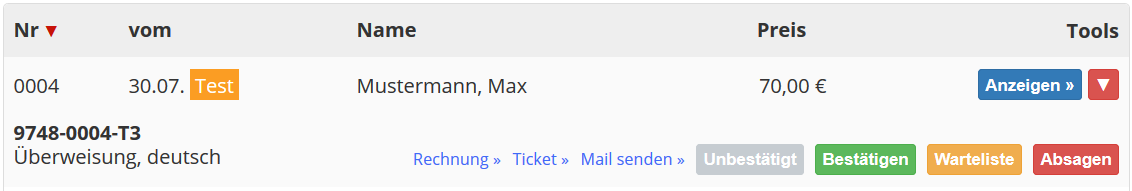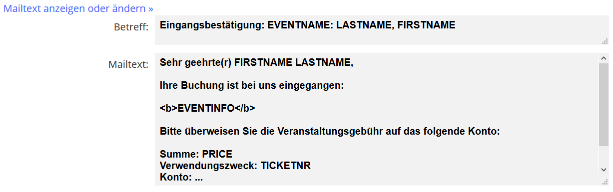 - Eingangs-Bestätigung (Unbestätigt). Diese Mail wird automatisch verschickt, wenn sich ein Teilnehmer bei einem kostenpflichtigen Event angemeldet hat. Sie enthält u.a. alle eingegebenen Daten der Buchung. Bei Bezahlung per Überweisung sollten in der Mail auch die Zahlungsaufforderung und alle dazu nötigen Informationen zu finden sein.