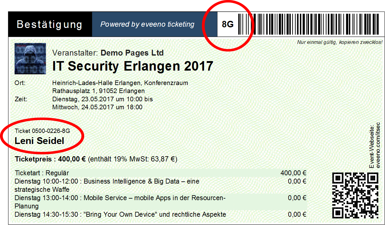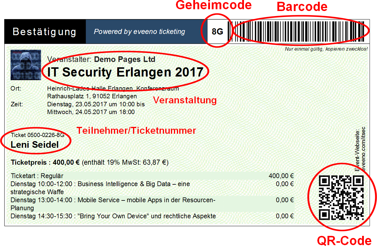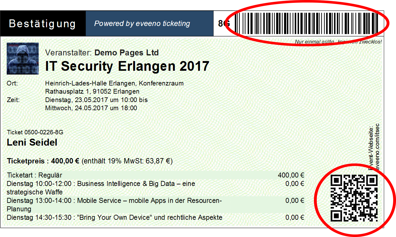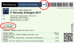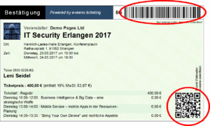 Das eveeno-Ticket enthält Angaben und Sicherheitsmerkmale, mit denen Sie die Gültigkeit des Tickets überprüfen und es gegen Fälschungen und Kopien schützen können: einen QR-Code für maschinelles Scannen und Entwerten sowie einen Geheimcode, der Fälschungen verhindert und auch ohne Scantechnik mit einer ausgedruckten Liste verglichen werden kann.