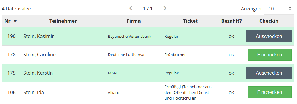 - Die betreffenden Gäste werden angezeigt, mit Buttons zum Ein- und Auschecken (bei entsprechender Voreinstellung der Aufgabe der Station).