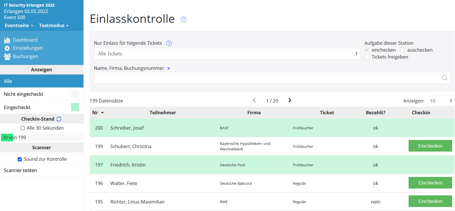 Auch nicht-elektronisch können Sie die Tickets sicher mit einer ausgedruckten Teilnehmerliste überprüfen. Dann brauchen Sie keine weitere Scanner-Technik.