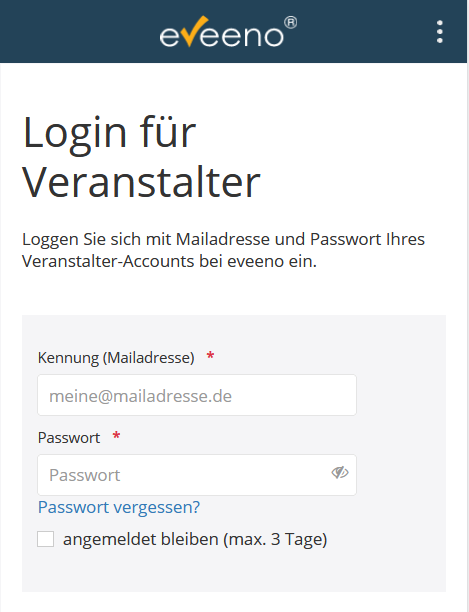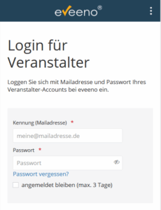 - Die Event-Webseite wird geöffnet – nun mit Ihrer eveeno-Kennung einloggen.