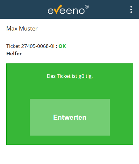 Zum Zeitpunkt der Einlasskontrolle öffnen Sie die App auf Ihrem Smartphone, loggen sich ein und wählen das gewünschte Event aus. Danach können Sie direkt Tickets scannen. Beim Scannen zeigt Ihnen die App an, ob ein Ticket bereits bezahlt („bestätigt“) ist und auch, falls es nicht gültig sein sollte oder storniert wurde. Zum Einchecken klicken Sie auf den Button „Entwerten“: