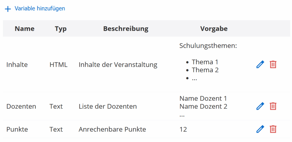 Im Beispielbild wurden Variablen für Schulungsinhalte, Dozentennamen und anrechenbare Punkte definiert: