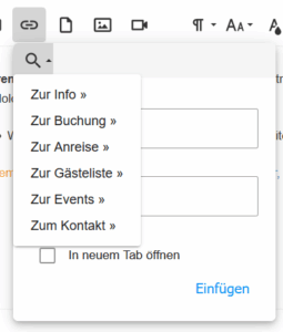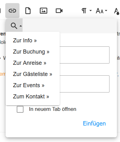 Ihre Eventseite enthält neben dem Buchungsformular weitere Seiten, auf denen sich Ihre Teilnehmer über das Event informieren können. Sie können mit dem Editor spezielle Links einfügen, mit denen Sie zwischen den Bereichen umschalten. Die entsprechende Funktion finden Sie unter dem Button „Link einfügen“ und der Lupe:
